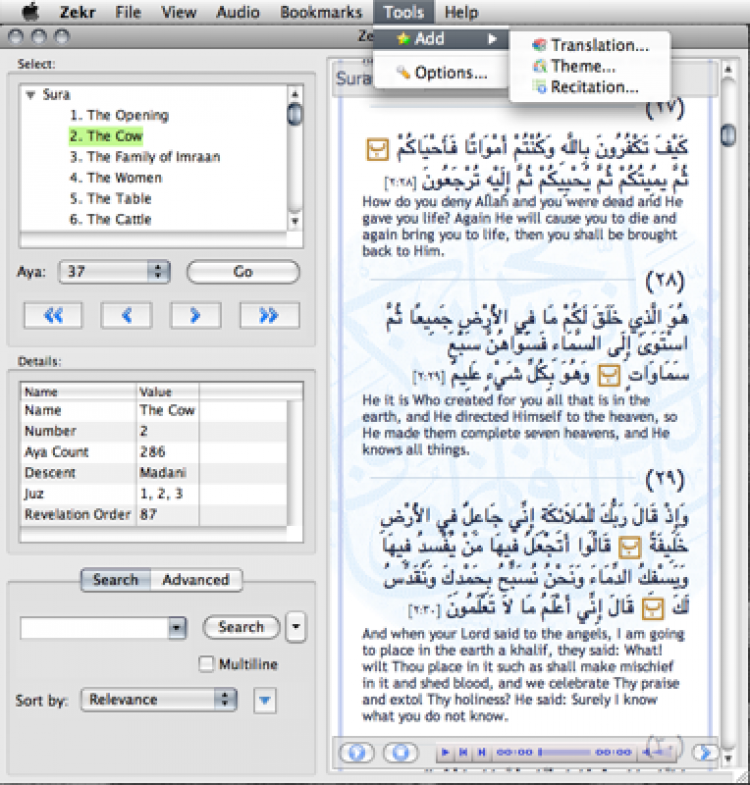 Zekr способна поддерживать различные расширения: многоязычные переводы, темы, чтецы, что делает ее максимально удобной в настройке. В программе имеется модуль для работы с закладками.