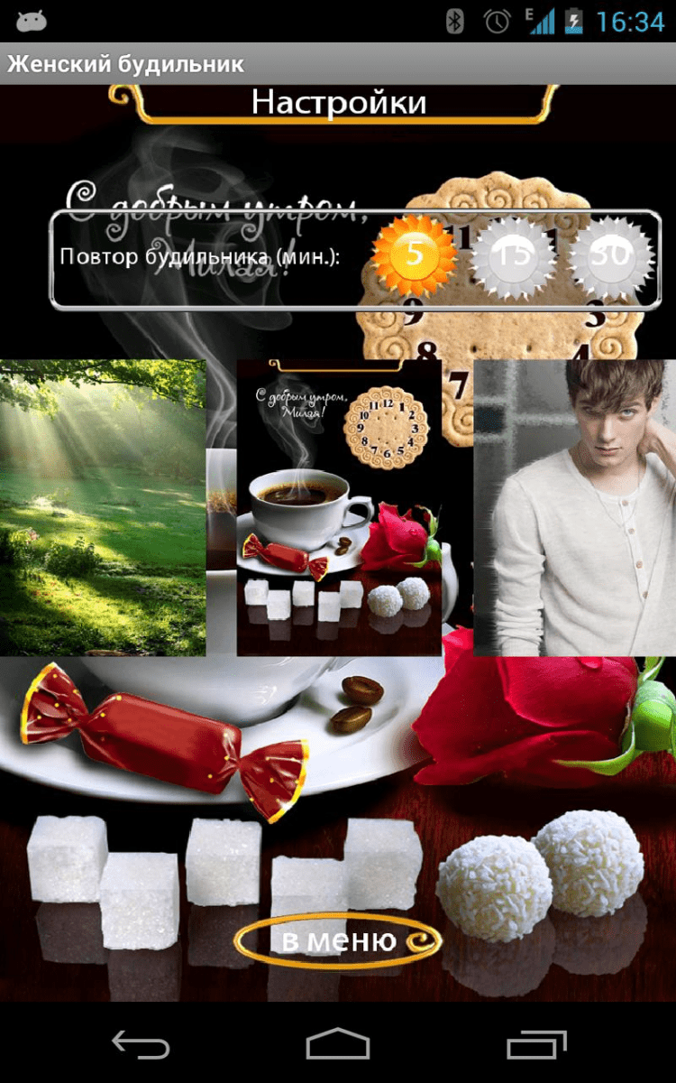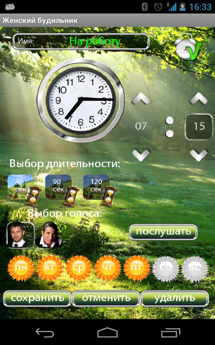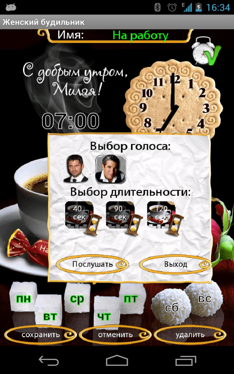 Женский будильник Хочешь просыпаться под нежные слова и щебет птиц, как настоящая принцесса? Хочешь начинать день с улыбки? Ласковый мужской голос разбудит тебя и пожелает доброго утра. Тысячи разных вариантов утренних слов ждет тебя в этом приложении.