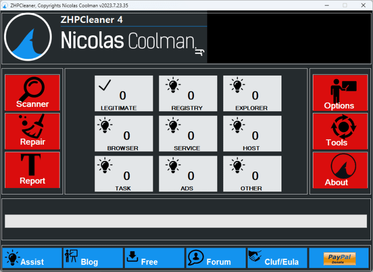 Программа поставляется в простом, интуитивном интерфейсе, который состоит из небольшого окна с тремя большими кнопками "Scanner", "Repair" и "Report". Они расположены в порядке использования. Сперва нужно запустить сканирование, затем процесс очистки, и в конце сохранить отчет о проделанной работе.