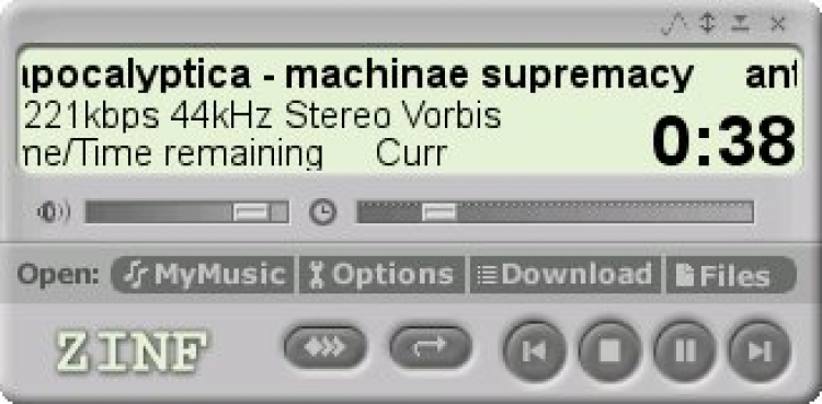 Zinf Свободный аудиоплеер с открытым исходным кодом. Плеер может воспроизводить звуковые файлы в формате MP3, Ogg/Vorbis, WAV и Audio CD, а также обрабатывать потоковое аудио SHOUTcast/Icecast, читать и записывать ID3v1/ID3v2/Vorbis теги, поддерживает скины и является частью открытой музыкальной энциклопедии MusicBrainz, оснащён оптимизированной версией декодера Xing MPEG, включает в себя мощный музыкальный обозреватель и встроенный менеджер закачек, который поддерживает загрузку файлов с сайтов.