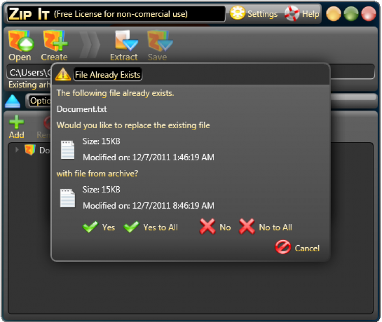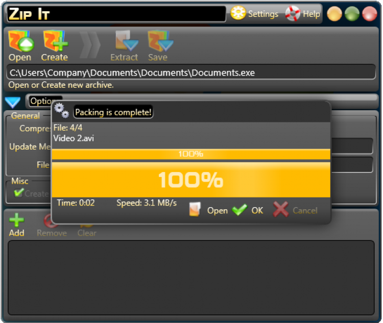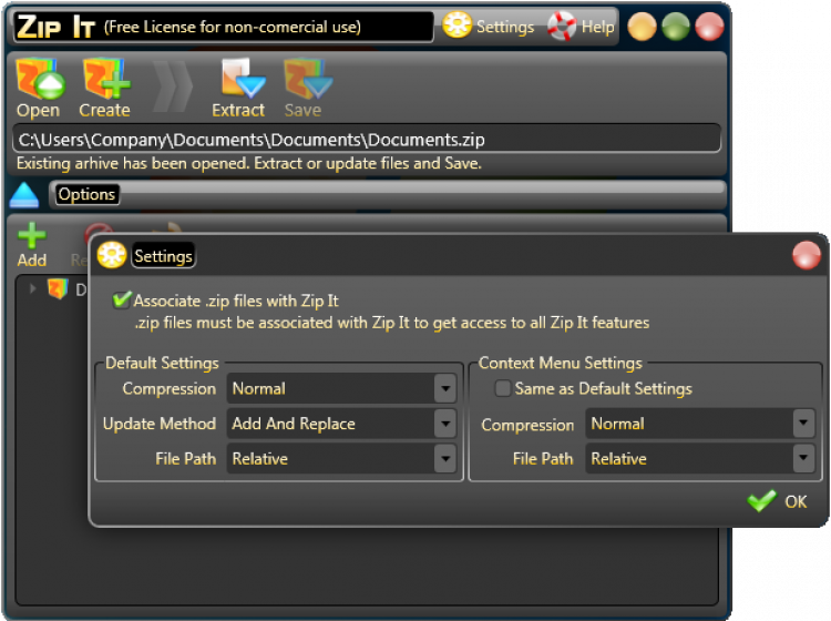 Архиватор встраивается в Проводник, позволяя работать с архивами через контекстное меню, и поддерживает Drag-and-Drop, так что файлы в архив можно добавлять простым перетаскиванием. Zip It имеет интуитивно понятный интерфейс. При создании нового архива программа предлагает на выбор несколько режимов сжатия, позволяет переименовать архив, и выбрать метод обновления его содержимого. После завершения упаковки архиватор показывает разнообразную информацию (время, скорость, количество файлов и пр.) Минусом данного архиватора является то, что он может работать только с архивами в формате ZIP и SFX. Другие широко распространенные форматы вроде RAR, TAR, CAB, LHS, или 7Z не поддерживаются.