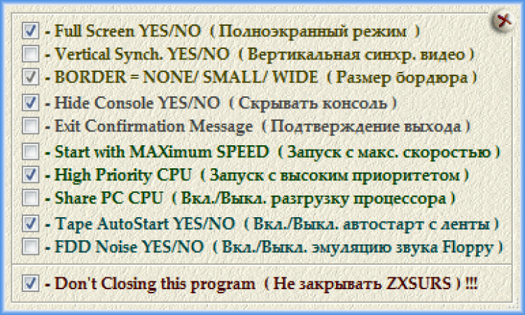 ZXSURS - это утилита предназначена для настройки и запуска с необходимыми параметрами эмулятора UnrealSpeccy (эмуляция персонального компьютера ZX Spectrum). Имеется возможность хранить несколько конфигураций. Настройка объёма ПЗУ, ОЗУ, прошивок, таймингов ЦПУ и др.